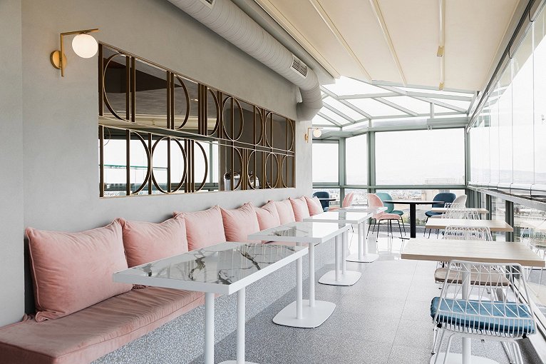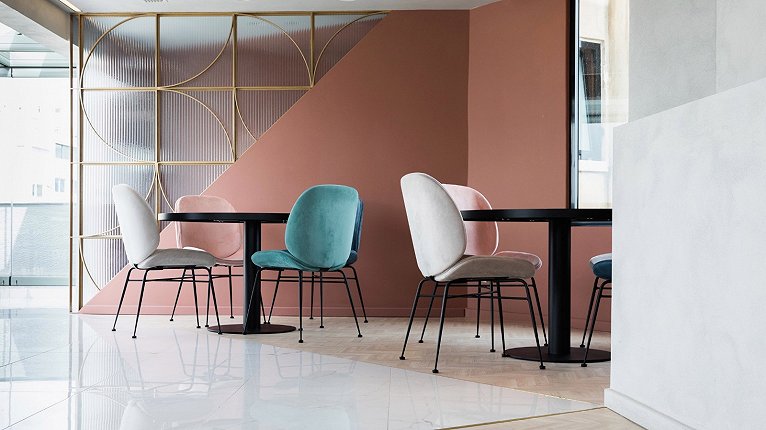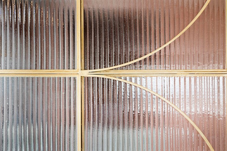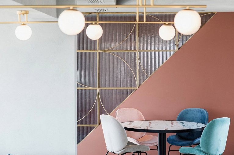材質:AJS改性水磨石、實心黃銅條、云朵拉灰大理石、打砂玫瑰金、瓦楞超白長虹波璃、粉色ICC