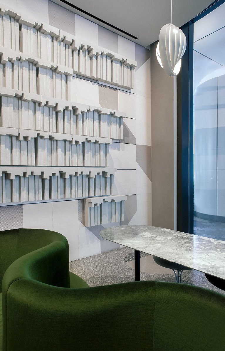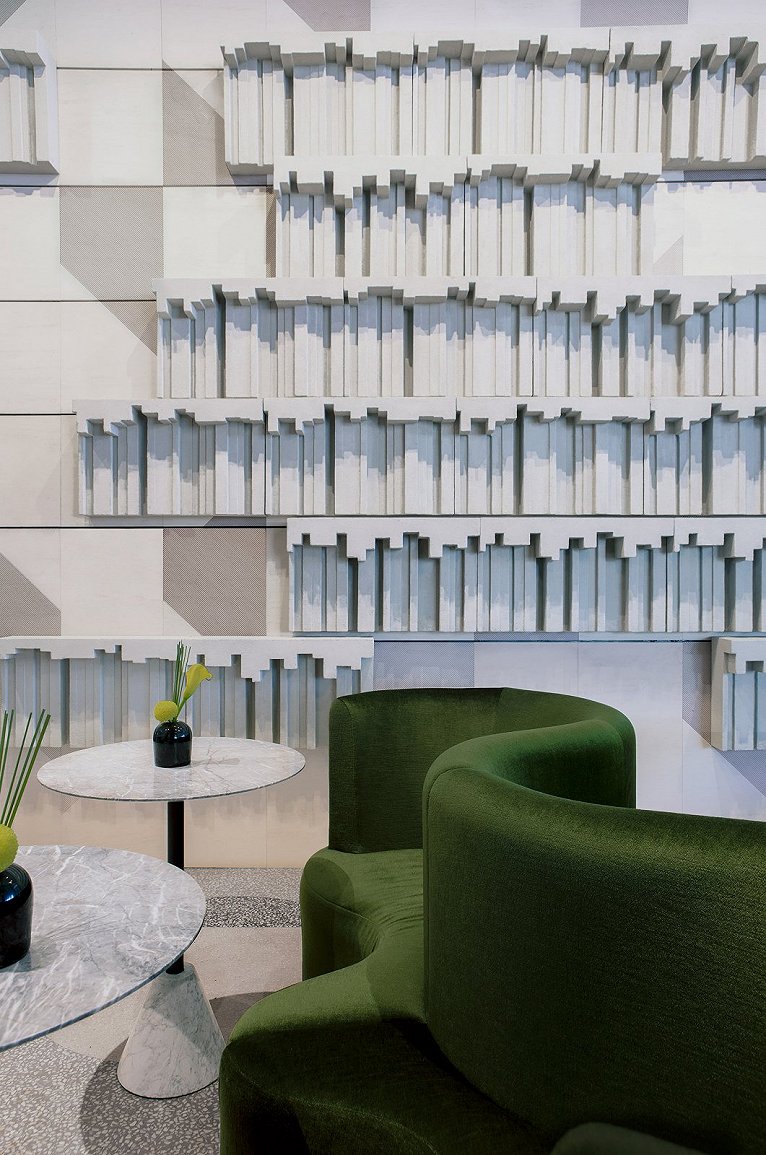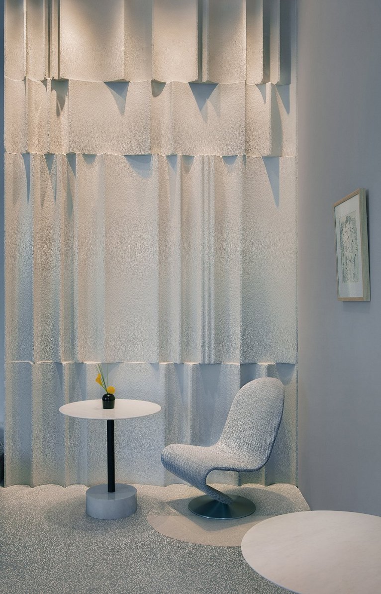 我們用抽象的雕塑表達(dá)想法,比如說我們做library空間,我們思考如何表達(dá)出體積感(有厚度),參考Rachel Whiteread的雕塑作品,突破傳統(tǒng)造型,增加了空間的趣味性。用書的負(fù)形表達(dá)書的功能符號(hào);我們同時(shí)在空間中用了“窗簾”的元素符號(hào)去豐富空間的語言, 把窗簾的現(xiàn)實(shí)造型映射在雕塑上,增加趣味性,將褶皺抽象化成不同弧長的凹形雕塑。天花和墻面都用了這一手法。