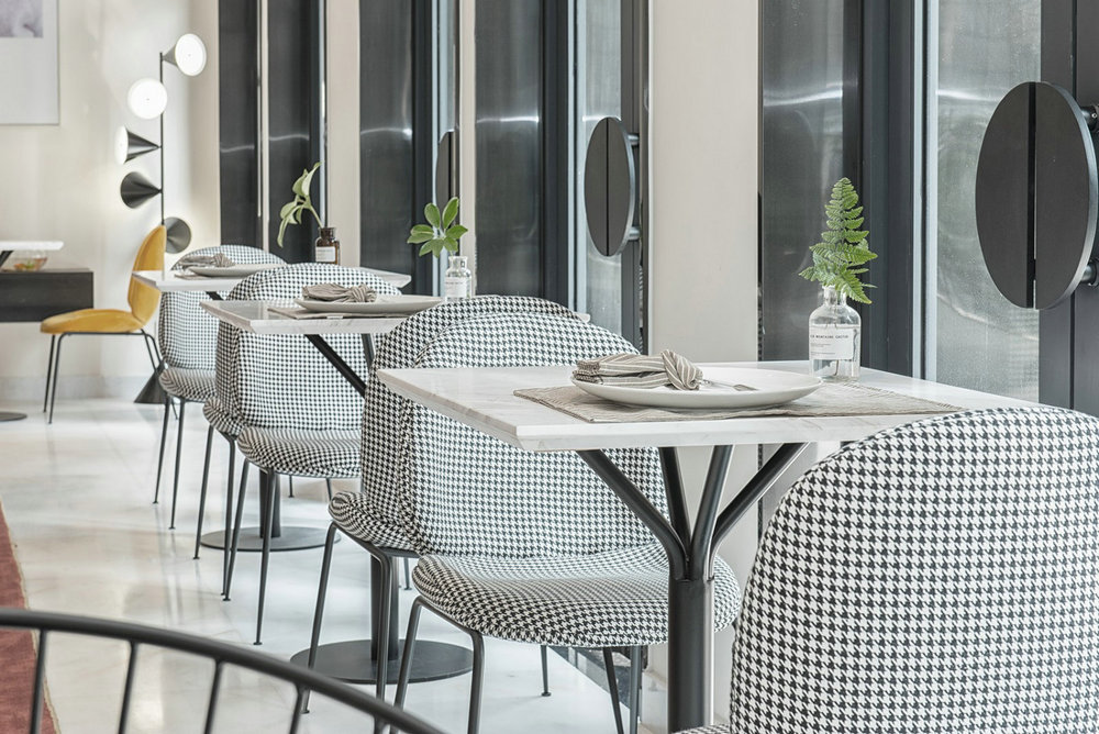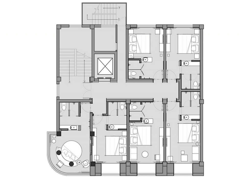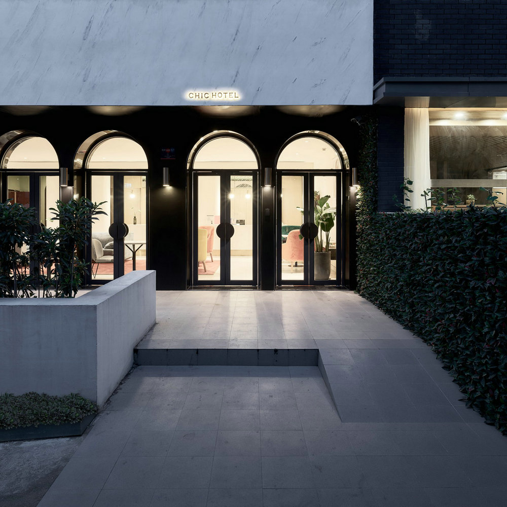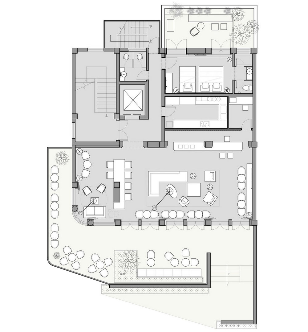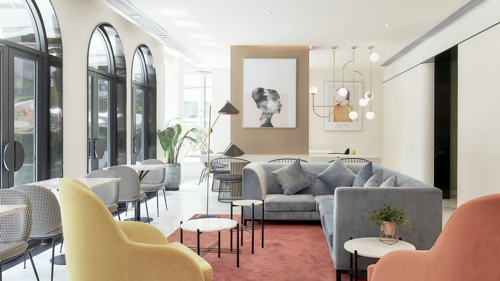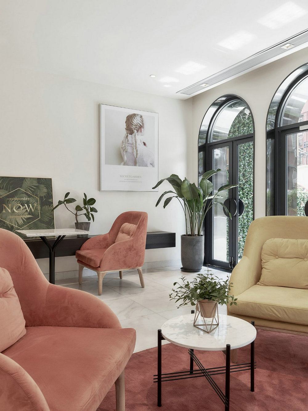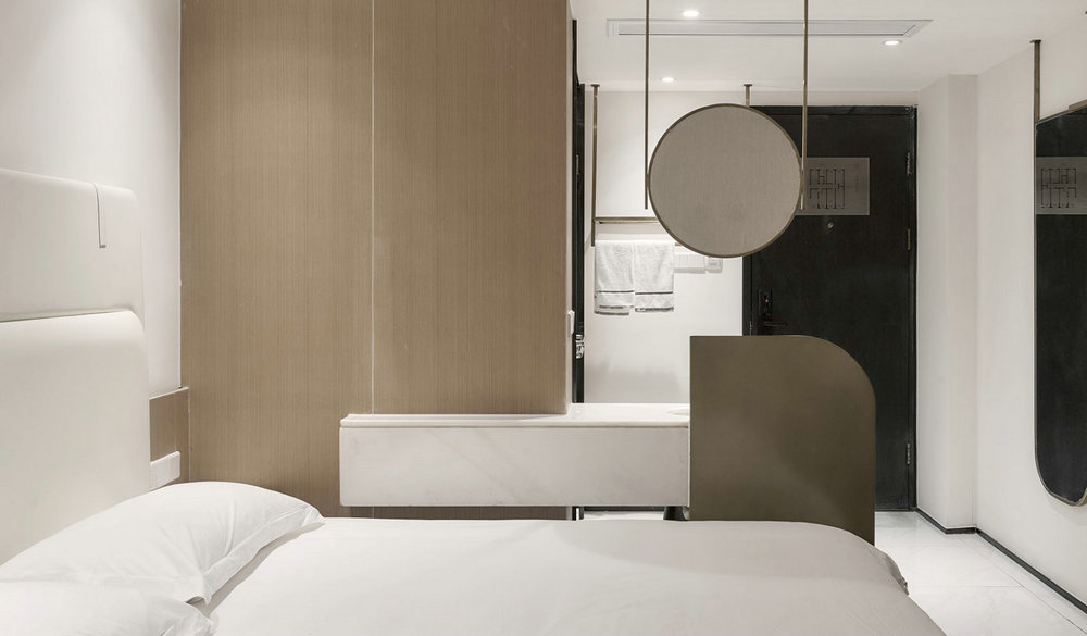 設計師開始接受甲方委托的時候,通過溝通敲定,把原有的44個客房縮減至37個客房,經過巧妙的設計和空間規劃,去除了酒店原有的暗房,同時對一層空間進行新的詮釋,將原有的私密性較差的一層客房,通過結構與功能的調整,使之成為大堂的一部分。整個一層外立面利用連續性的拱門和落地玻璃門設計,將室外的活動空間與室內的休閑空間相結合。