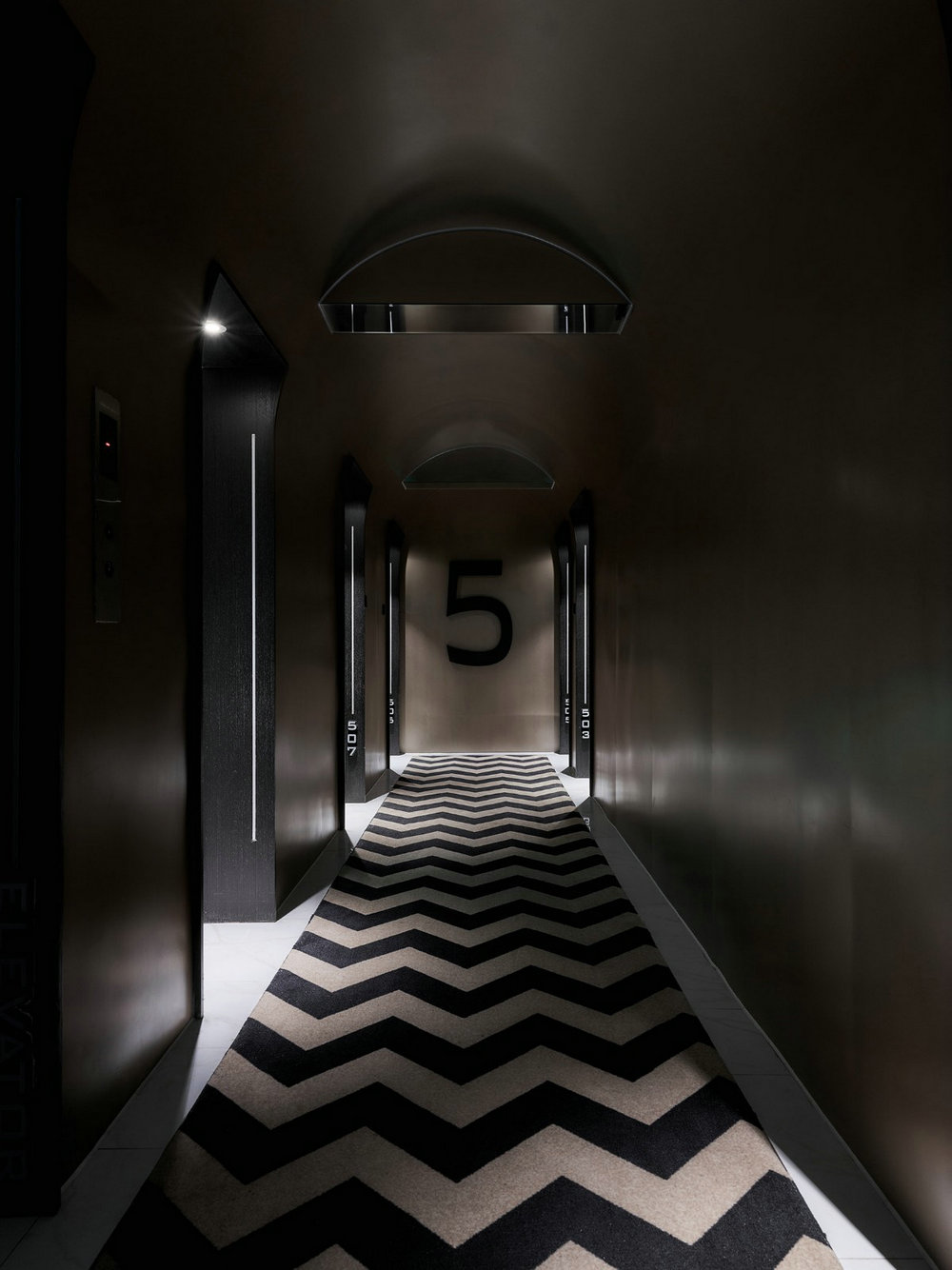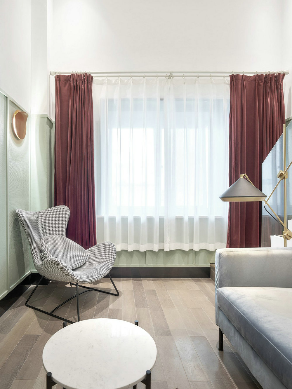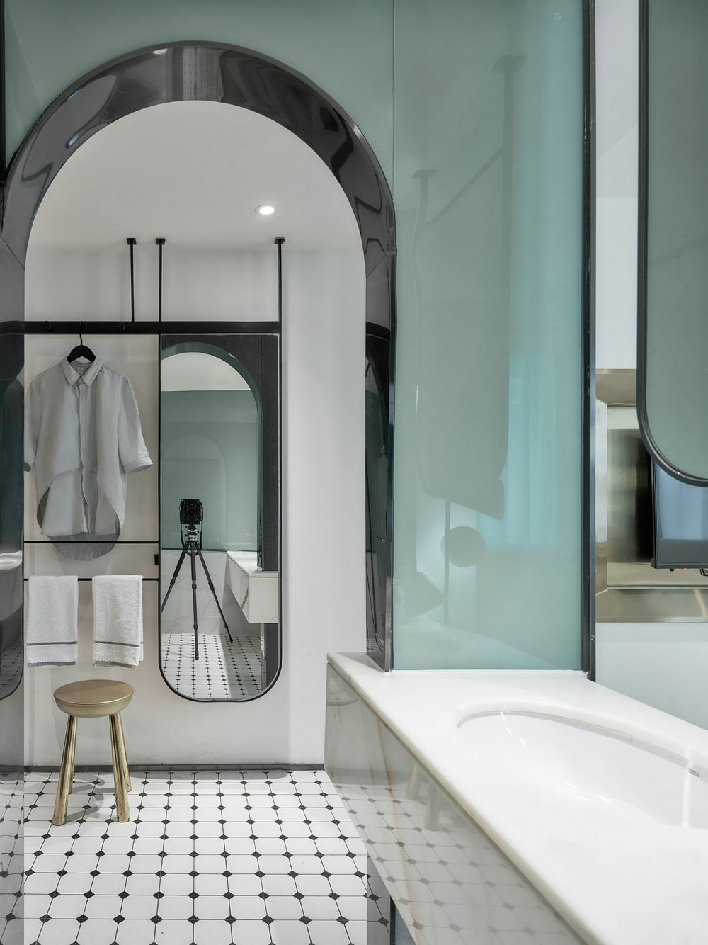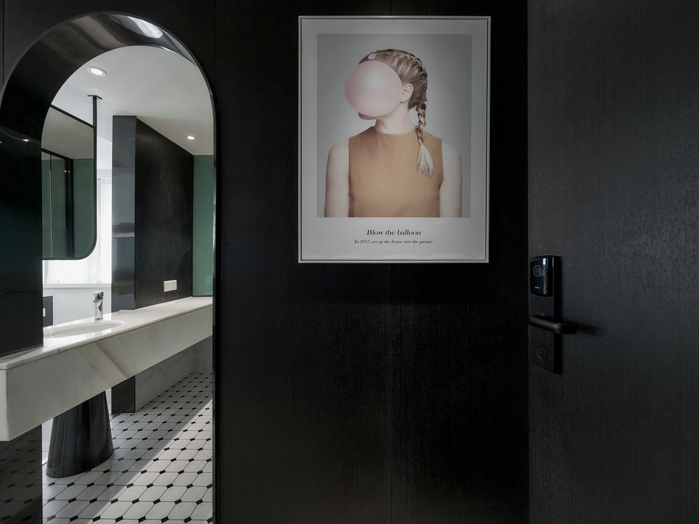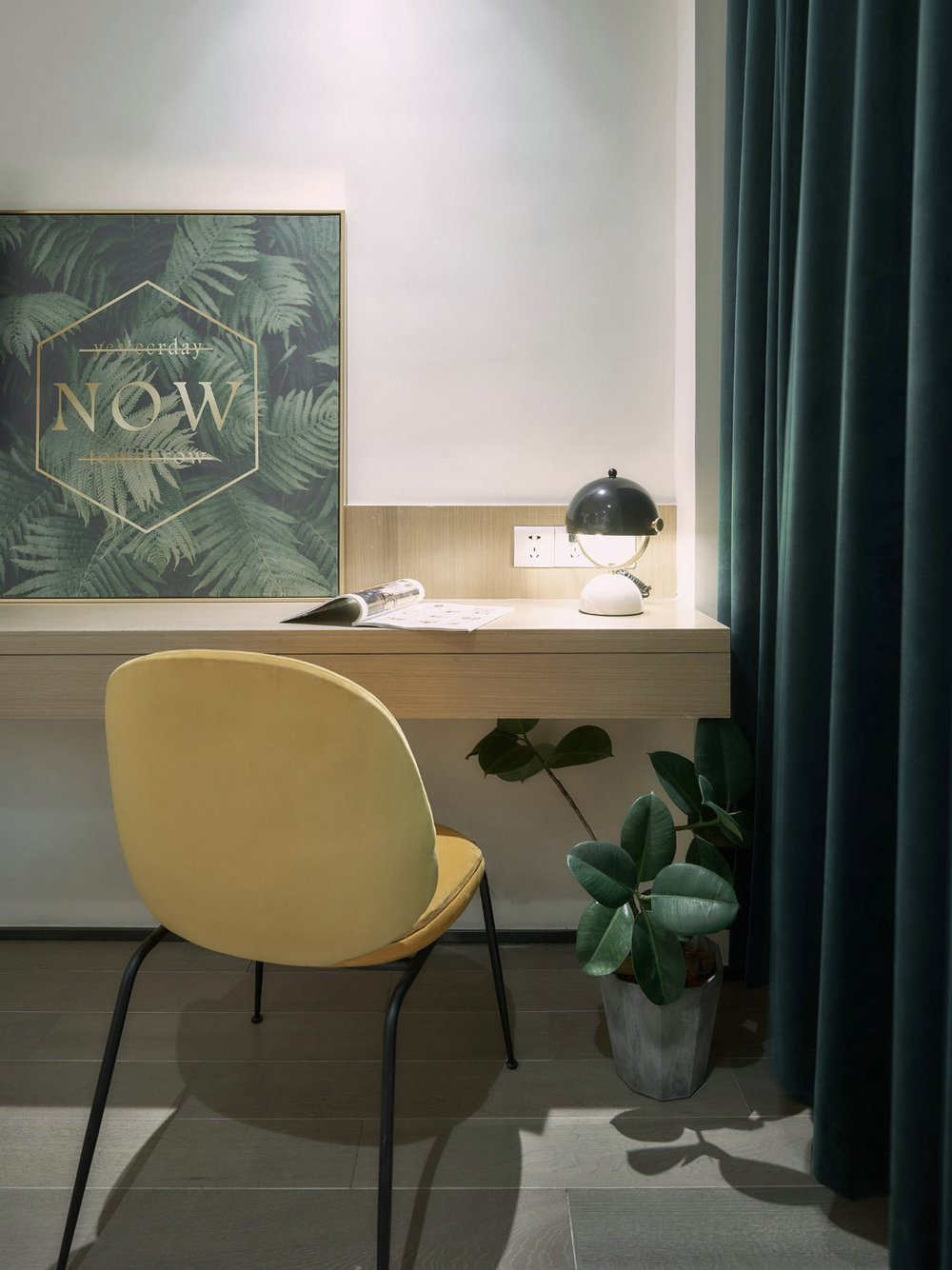 客房以純潔的白與黑白格沙發、墨綠色的絨面窗簾形成鮮明的對比,更加營造出小空間的利落感。灰度的綠色碰上濃烈的酒紅色,在陽光的映射下,摩擦出極致的火花。將整個室內空間變得靈動無比,生機盎然。將帶有儀式感的魅力空間,表現得淋漓盡致。環抱大自然的妙趣橫生,感受少女般的欣喜狂熱。在色彩上,設計師更是別具一格,采用橘紅和檸檬黃的搭配,巧妙運用了色彩的飽和度,以柔美的象牙白與跳躍的色彩交錯點綴,在米白色的基底下,色彩如同跳躍的音符,靈動且美好。酒店的過道依舊延續了大堂的拱形元素,使之連貫整體。利用降低走廊的燈光照度,配上波浪紋的地毯、黃銅色的金屬漆,營造出一種深邃的神秘感。從過道走向任何一處空間,都讓你有種豁然開朗的感覺,如時光機隧道般,帶你通往美好的向往之處。