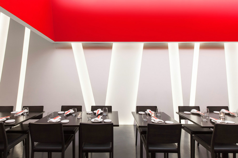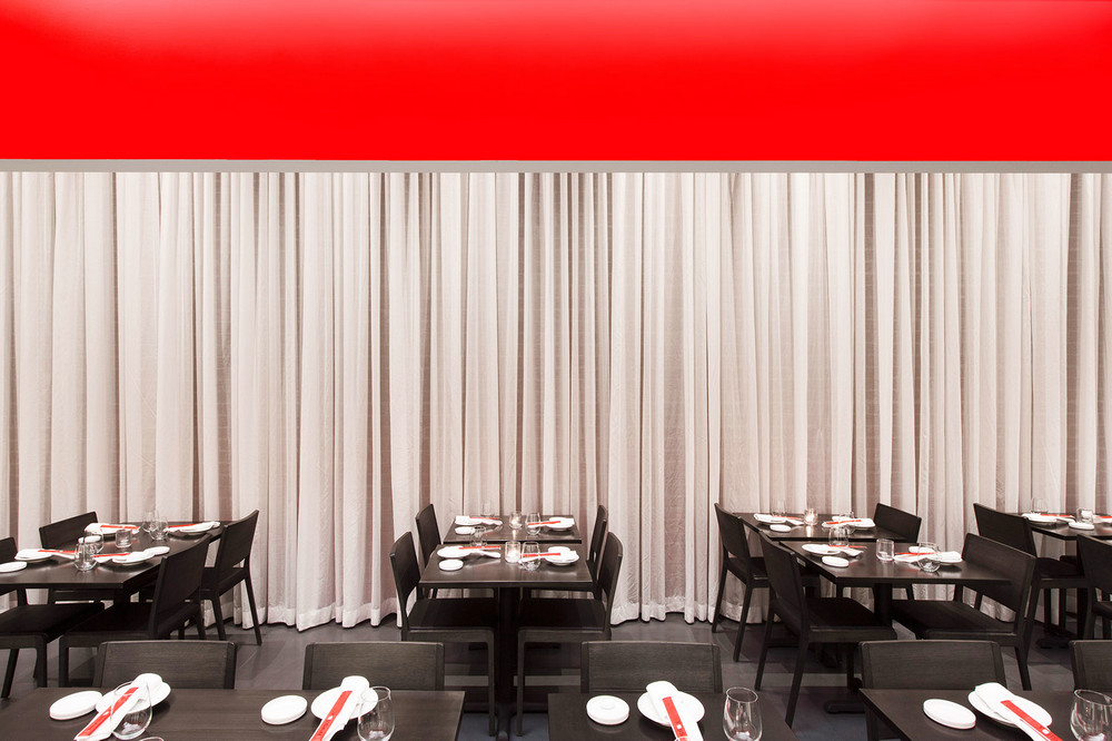 從接待收銀臺繼續(xù)往里走,用餐區(qū)的天花板上驚奇地出現(xiàn)了兩個巨大的倒扣飯盒狀的體量,這兩個體量配有反光的紅色飾面,不僅突出強調(diào)了中心用餐空間,更為其下方的食客們提供了一個充滿了溫暖光線的用餐環(huán)境。在這兩個輕巧的懸浮體量之下,是一片配有定制餐桌的用餐區(qū)。餐桌通過特殊的烤藍過程鍛造而成,該鍛造過程與日本著名的器械工具和餐具的精加工過程類似。室內(nèi)餐桌沿著兩片各具特色的墻體排列?,F(xiàn)有的噴砂面磚墻展現(xiàn)出一種溫暖的赤褐色,隱藏在半透明的幕簾之下。這片幕簾不僅可以為室內(nèi)空間增添一抹柔軟的氣息,更是一個聲音緩沖區(qū)。這片磚墻的對面是一片由傾斜的發(fā)光面板和一般實體墻面板組成的墻體,入口區(qū)域從天花板上垂下的竹葉斑駁的影子映在實體墻面板上,營造出一種動態(tài)美感。每一片發(fā)光面板都覆有由織物和塑料構成的定制飾面。這面墻為Yojisan餐廳設計提供了主要交通流線的視覺引導,并通過對一系列負空間的處理,營造出一種穿越光帶的空間體驗。