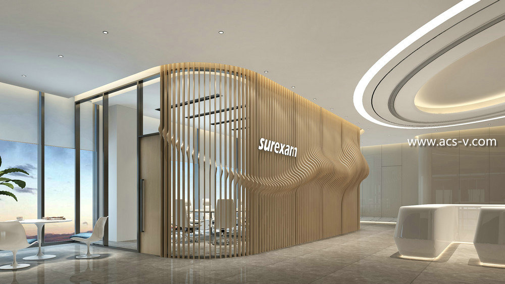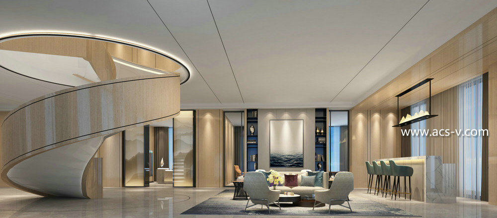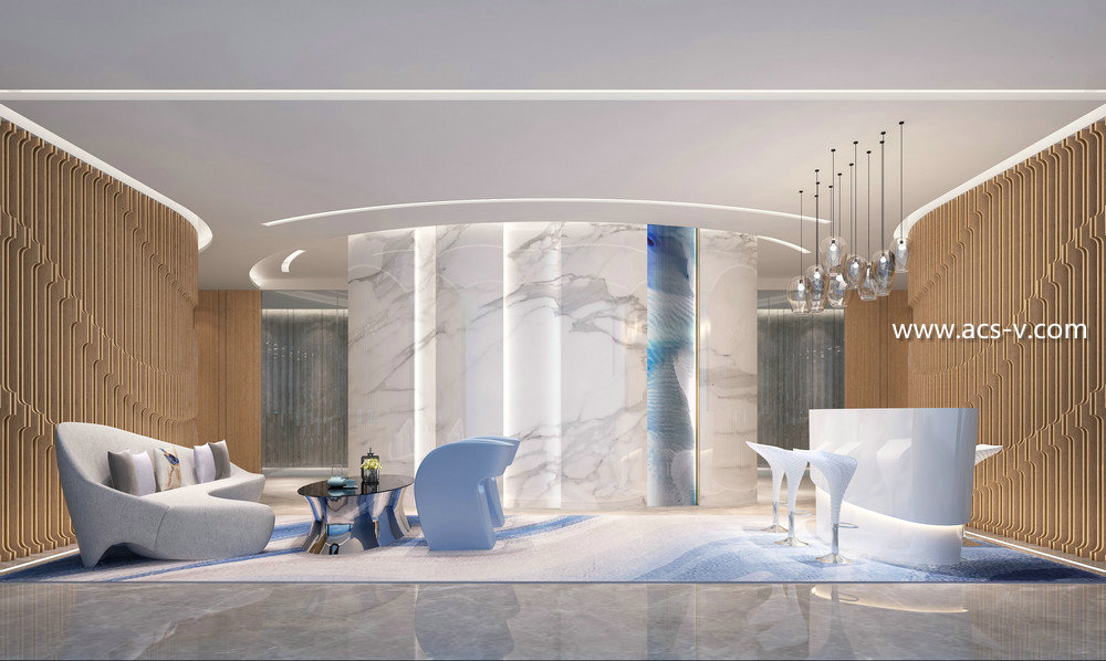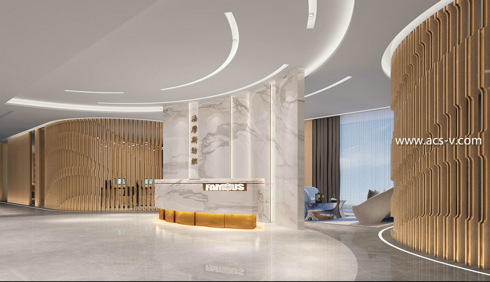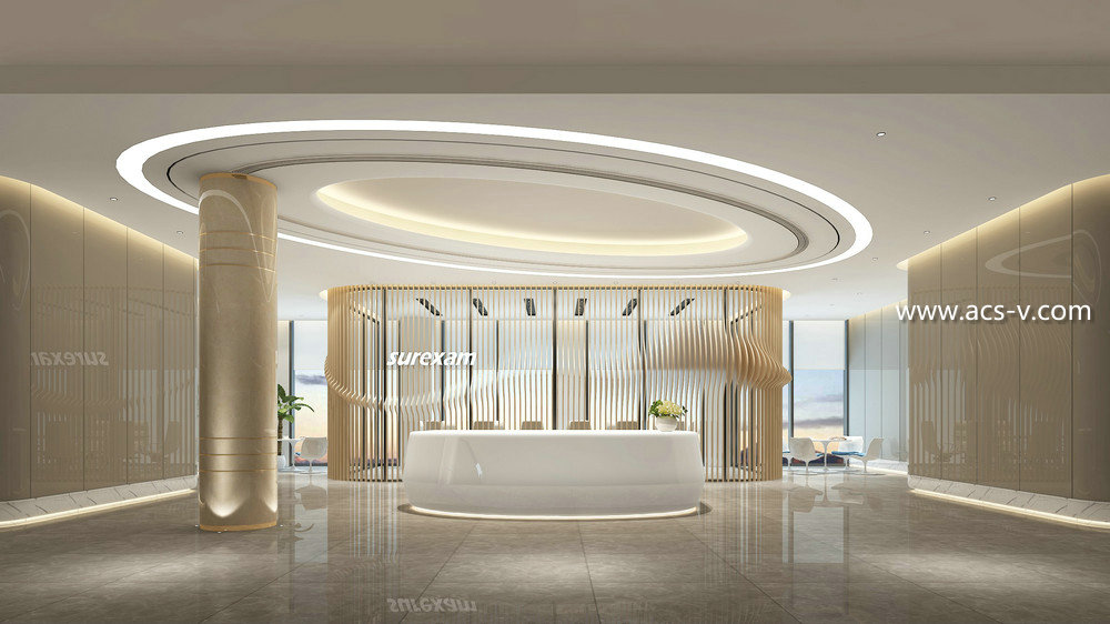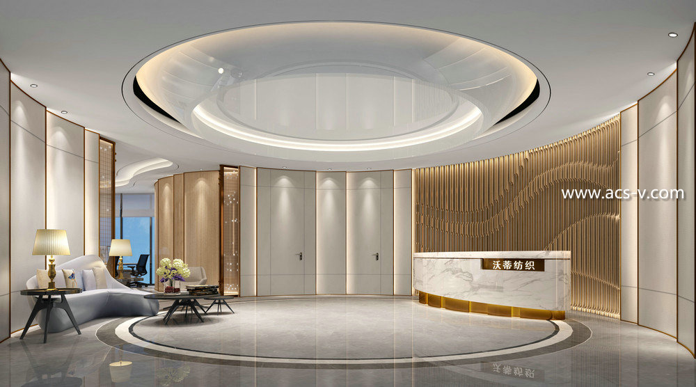 設計主要材料:實木面板烤漆、抗靜電仿石PVC地板膠、石膏玻璃纖維鋼、定制木工造型安裝、高端白瓷漆、不銹鋼鈦金條等