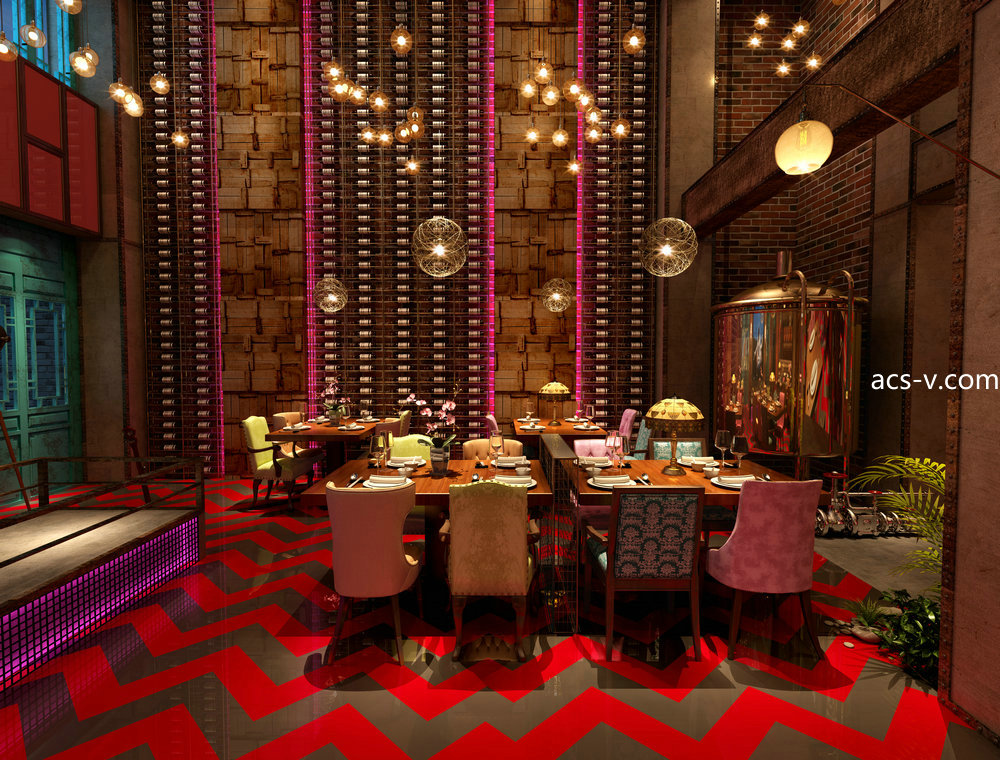 設計主要材料:銹蝕鋼管、藝術仿古磚定制、水泥漆、榆木實木板、大理石、不銹鋼、玻璃