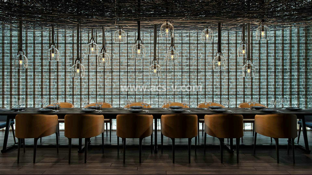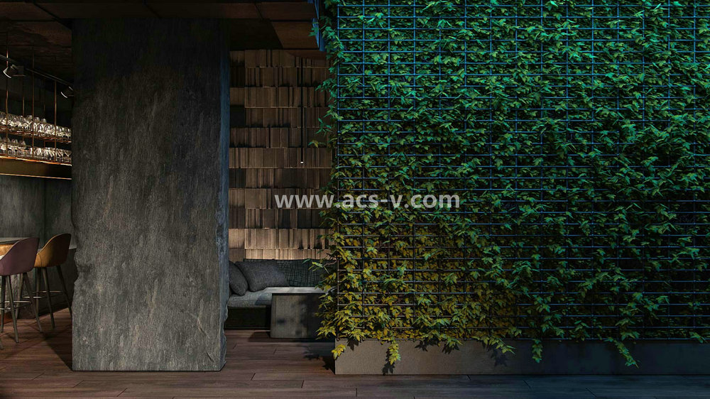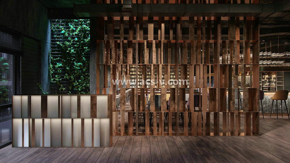 設(shè)計(jì)主要材料:木紋磚、巖石板、玫瑰金不銹鋼、紅銅定制、植物墻、定制設(shè)計(jì)師家具、定制樺木條、天然大理石