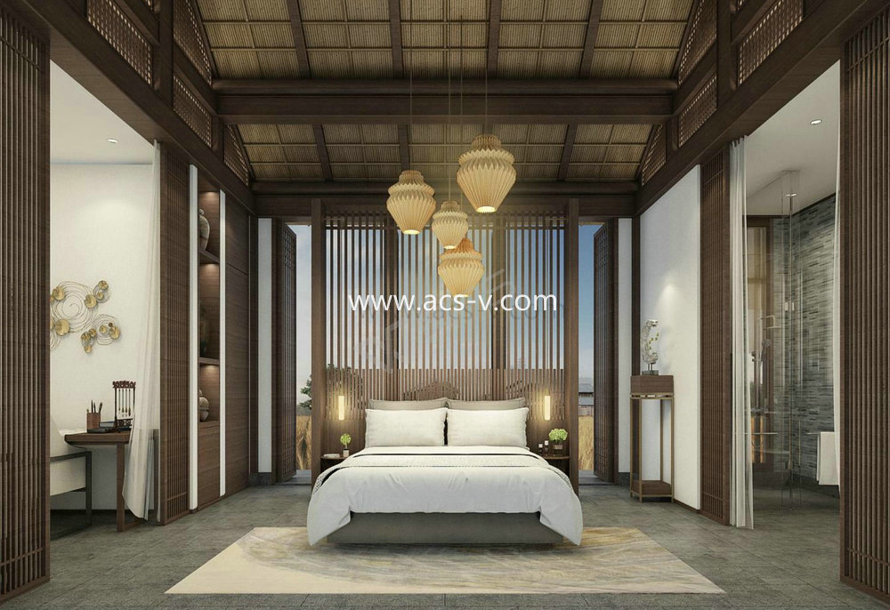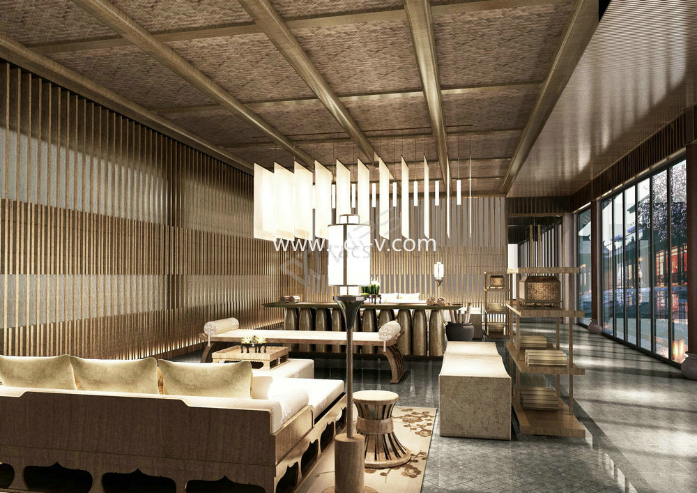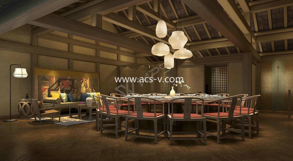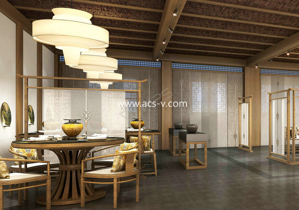 設計主要材料:黑砂石,中式雕花定制,榆木,杉木,天然大理石,拉絲不銹鋼,定制中式燈