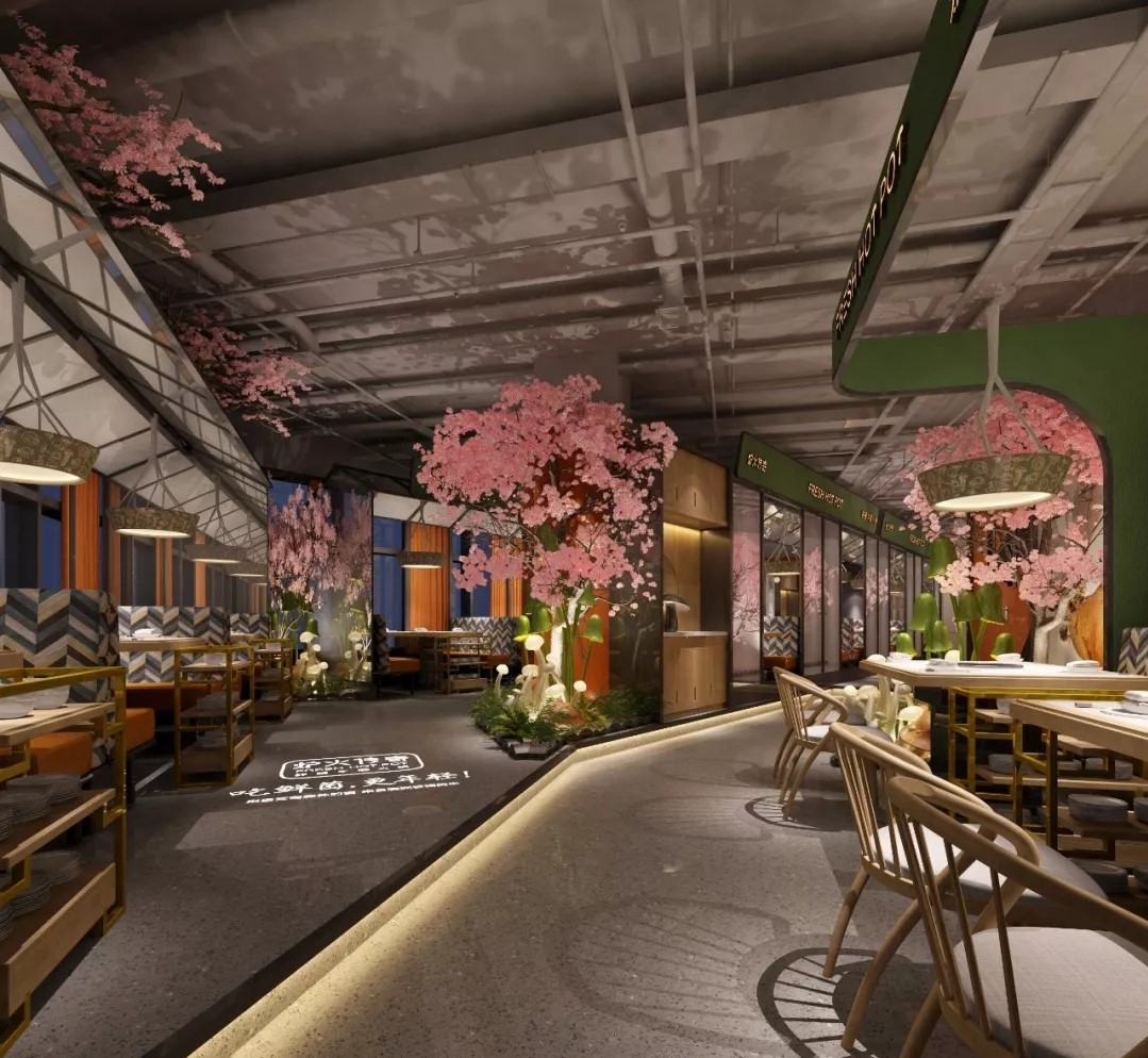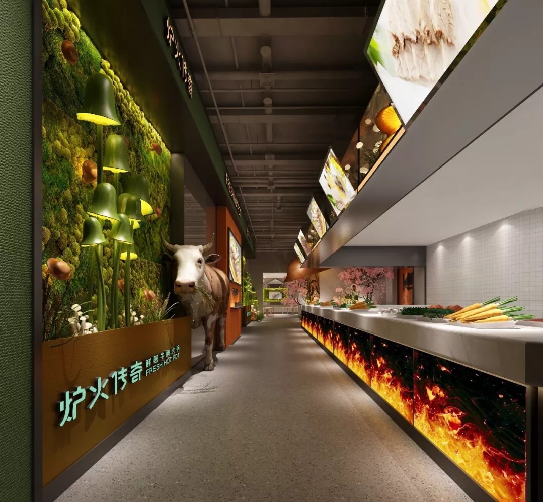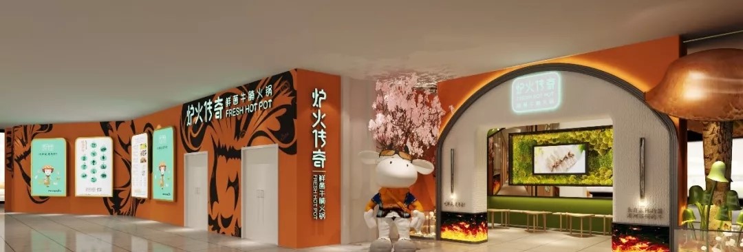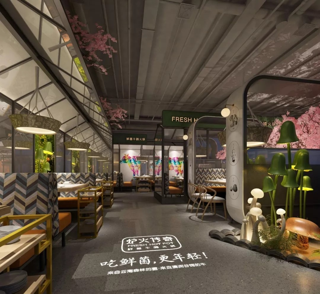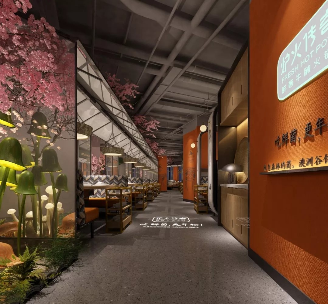 門頭,可愛的小牛和菌菇的雕塑為空間增加了趣味性,同時(shí)還可以吸引更多在店鋪外游走的潛在客群。步入空間,第一眼便可看見一頭在吃草的“牛”,空間一下俏皮了很多;綠色菌菇墻面將品牌浪漫植入。明檔不僅給了菜品展示的空間,還將爐火的形象也一并融入。多種造型的發(fā)光蘑菇,打造了鮮菌的叢林景象。櫻花樹在熱烈的綻放,深處繪以彩牛,為空間點(diǎn)綴浪漫元素。橙色的加入,營造出活潑又舒適的自然空間。在這里,你可以給自己最愜意的慵懶和自由。