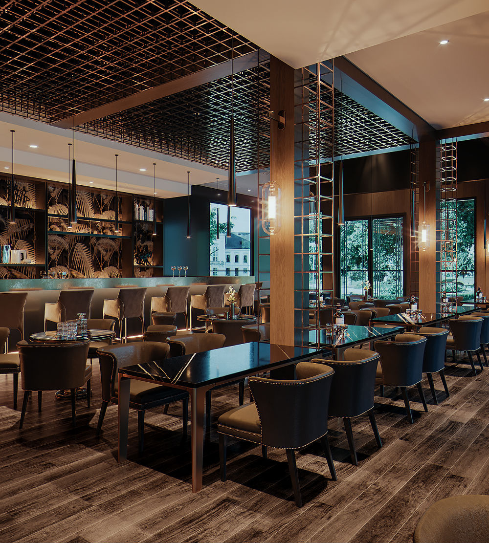 五:地域文化環境是影響餐廳設計的重要因素。簡約中國風的餐廳設計,從江南園林意境中尋找靈感,融合現代企業文化元素,現代中透著傳統,現代中揉著古典,舒適的意境始終是東方人特有的情懷。清新自然的環境裝飾,別具匠心的空間布局,打造具有企業文化特色和當地文化特色的主題餐廳。簡約輕奢風格是現代餐廳設計的風格基調,而作為2019年市場中現代流行的風格趨勢,主題餐廳設計更能突顯餐廳的風格特色,讓人直觀的覺得餐廳的與眾不同,有格調,深受人們的喜愛。